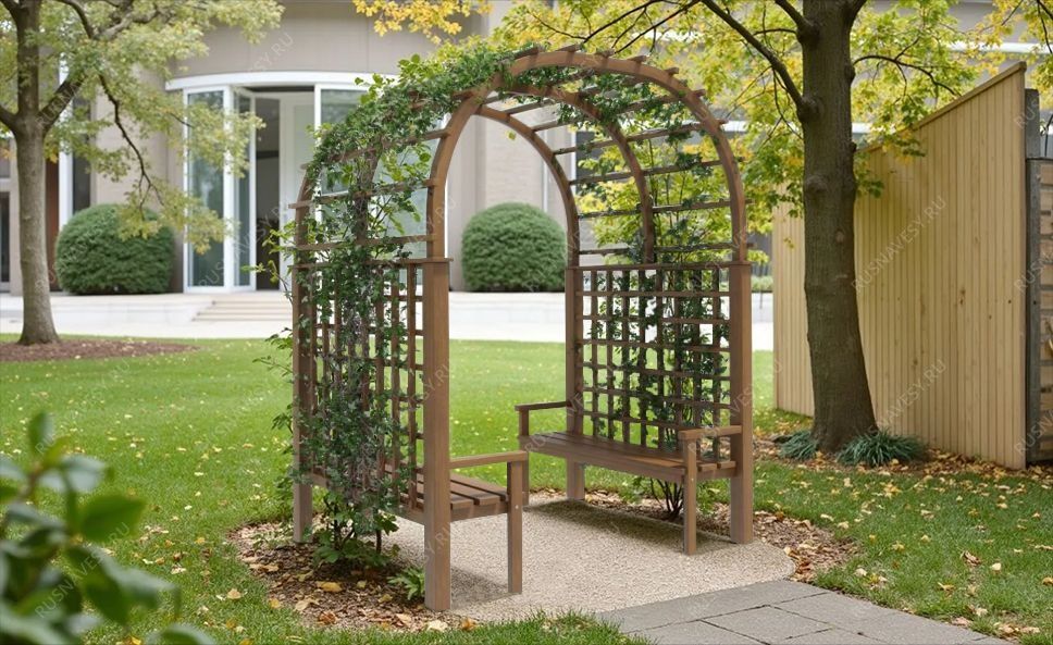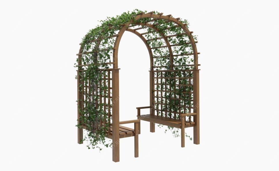 Установите на вашем садовом участке поистине изысканное изделие - перголу-шпалеру со скамейками «Руза»! Украсьте её подходящими растениями и отдыхайте в тени, сидя на удобных деревянных скамейках.                                                                                                                                                                    Материалы: Опоры, каркас, скамейки: Брус из хвойных пород древесины. Покрытие - атмосферостойкая лессирующая акриловая пропитка с лаком. Стандартные цвета: Палисандр, Махагон, Тик.       Варианты исполнения: ангарская сосна, лиственница. Возможность выбора цвета из палитры.