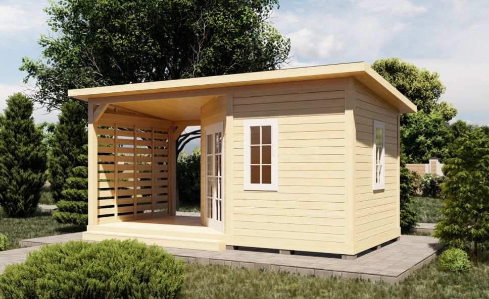 Изделия из клееного бруса предлагаются в трёх комплектациях: «несущий каркас», «базовая» и «премиум». В последнем случае стойки выполнены не из цельного массива дерева, а из клеёного бруса, а обрешётка кровли – из имитации бруса с замковым соединением.